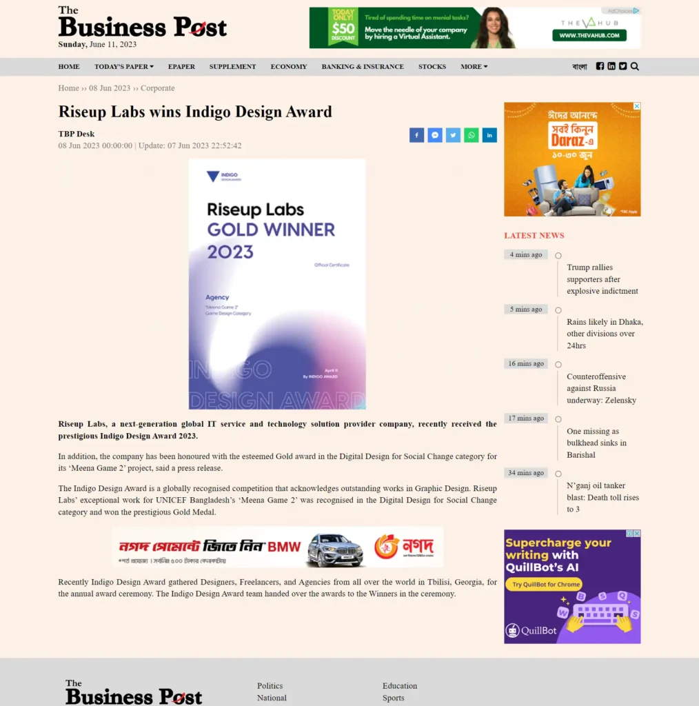 Riseup Labs won the prestigious Gold Medal in the Indigo Design Award. It won the Award for its exceptional work for UNICEF Bangladesh’s ‘Meena Game 2’. The game design of the popular cartoon ‘Meena’ was recognized in the Digital Design for Social Change category.